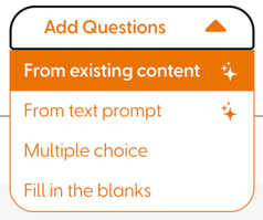 From existing content – Select existing content available on the platform to automatically generate multiple choice quiz questions, allowing you to specify the number of questions to generate.