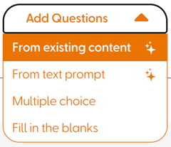 Use AI to generate quiz questions based on existing Thirst content. You'll be prompted to select the content you’d like to base the quiz on, and let Thirst AI suggest questions.
